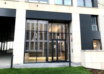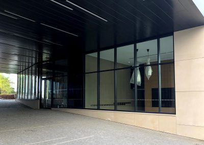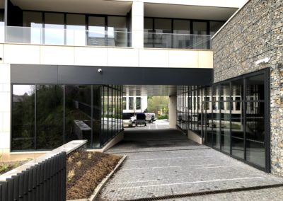 Použitý systém: fasádní systém Schüco FWS 50.SI, okenní a dveřní systém paralelně odstavné posuvné sklopné dveře (PASK) Schüco AWS 75.SI a ADS 75.HD.HI